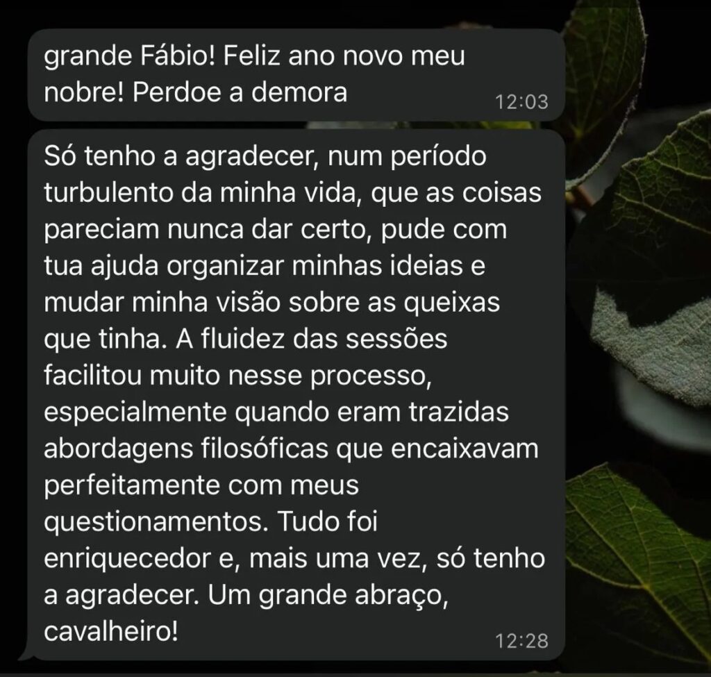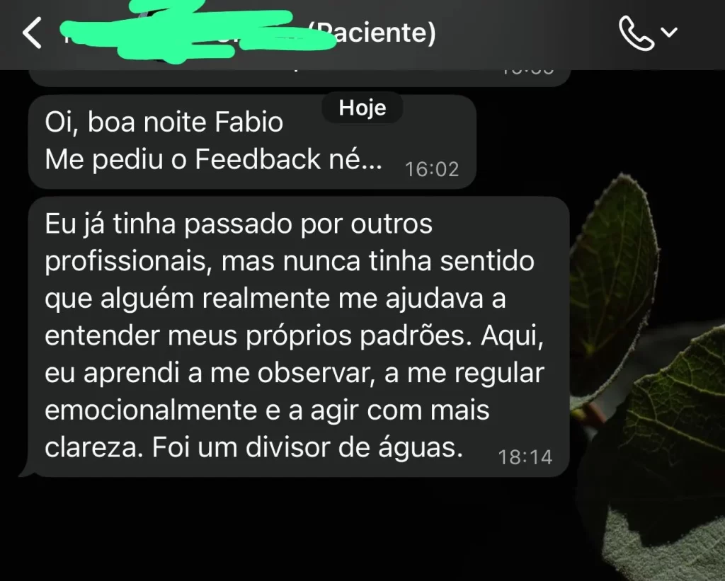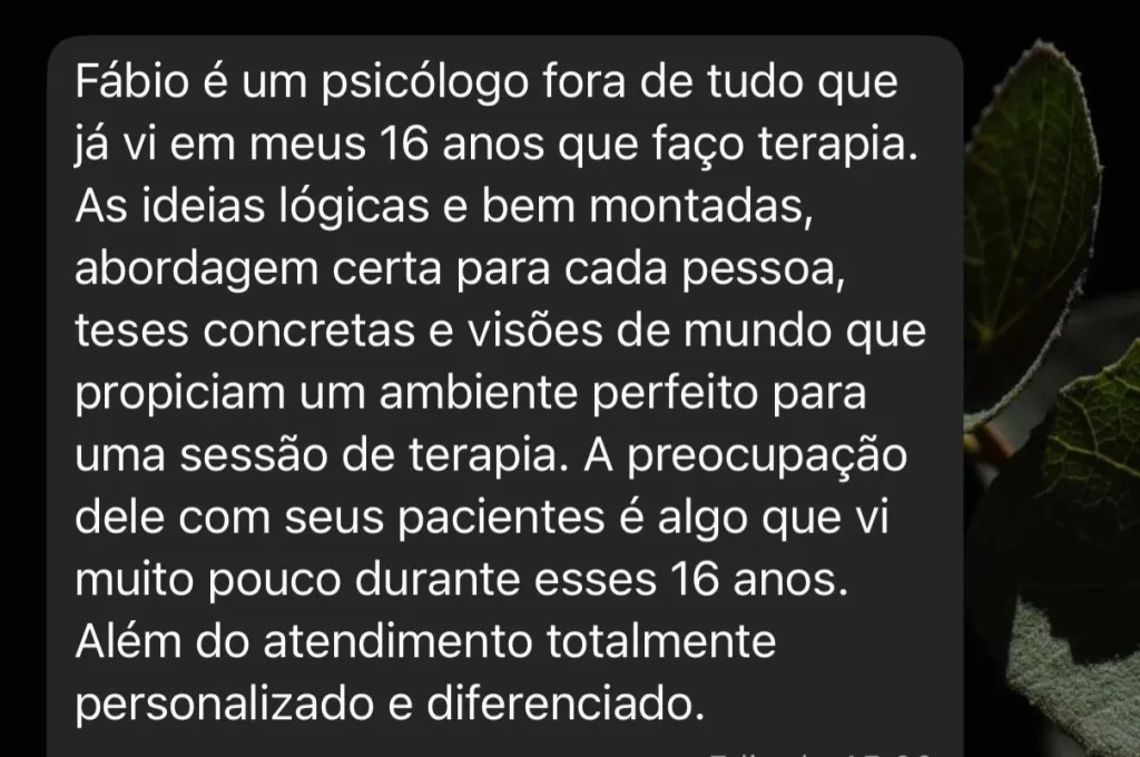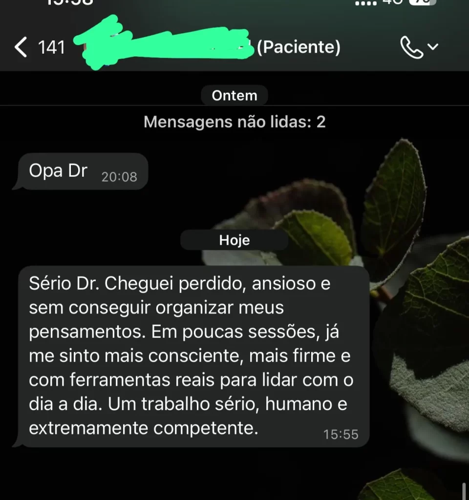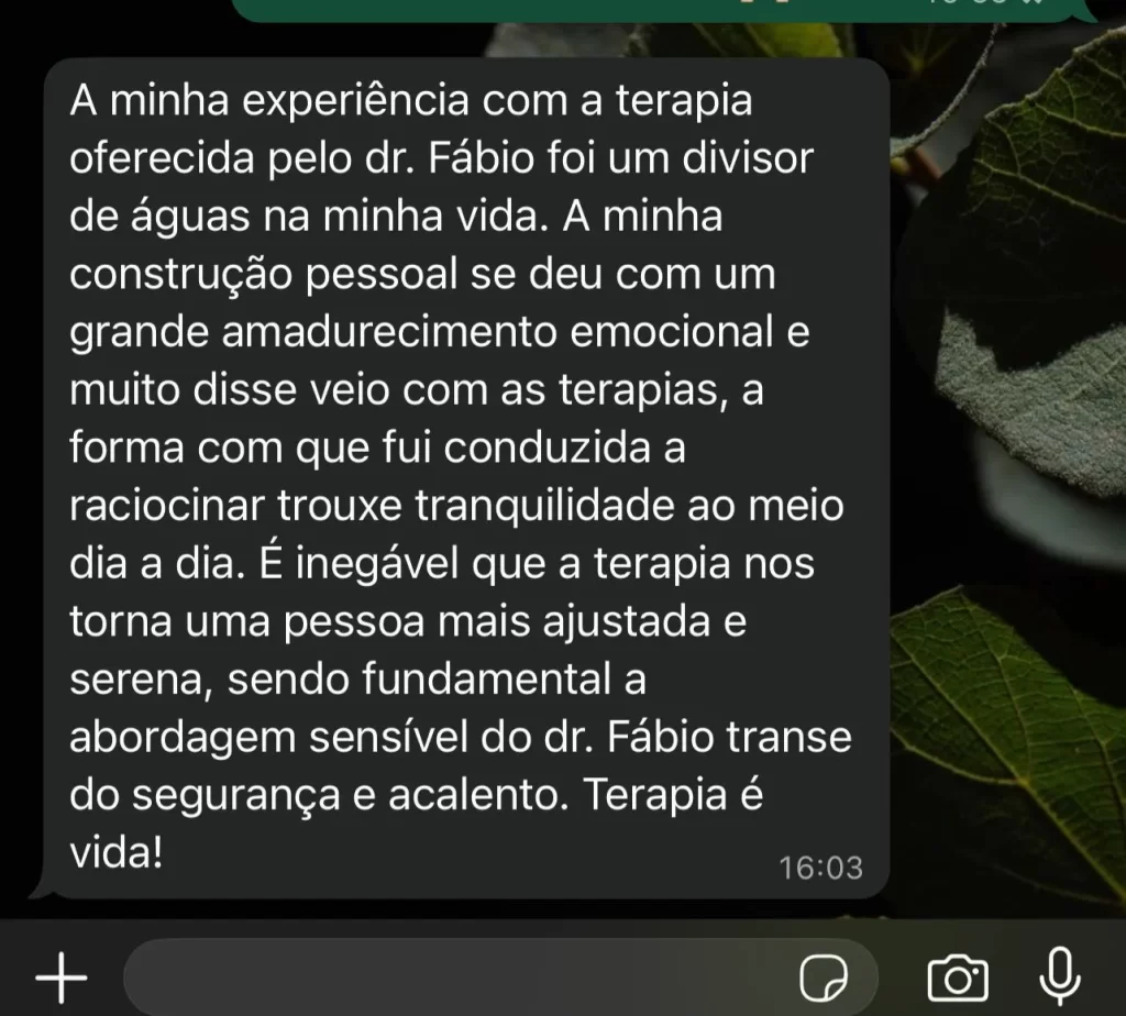 Minha filosofia de atendimento é o oposto disso. Minha terapia é conduzida com método, clareza, agilidade e acompanhamento contínuo para poder compreender junto a você as causas dos problemas e construir uma nova forma de viver mentalmente saudável.